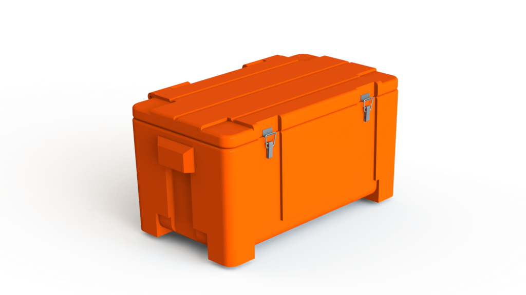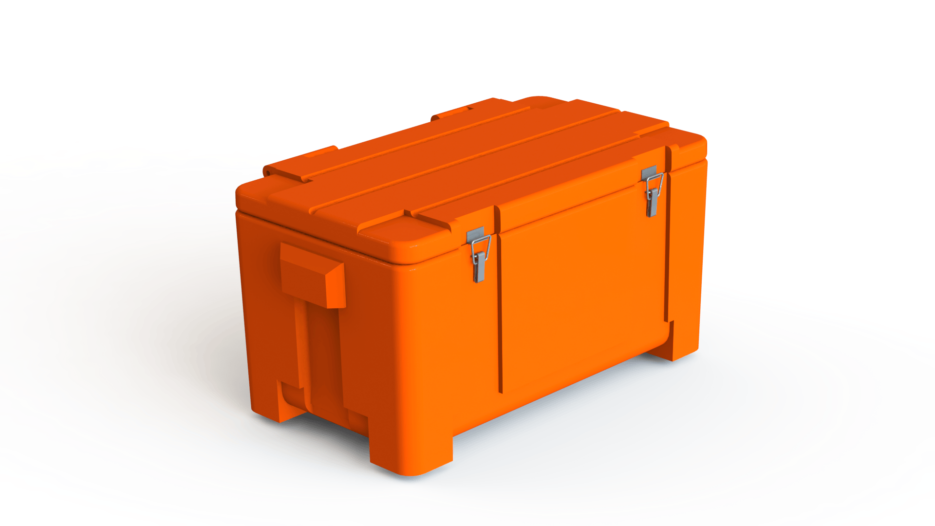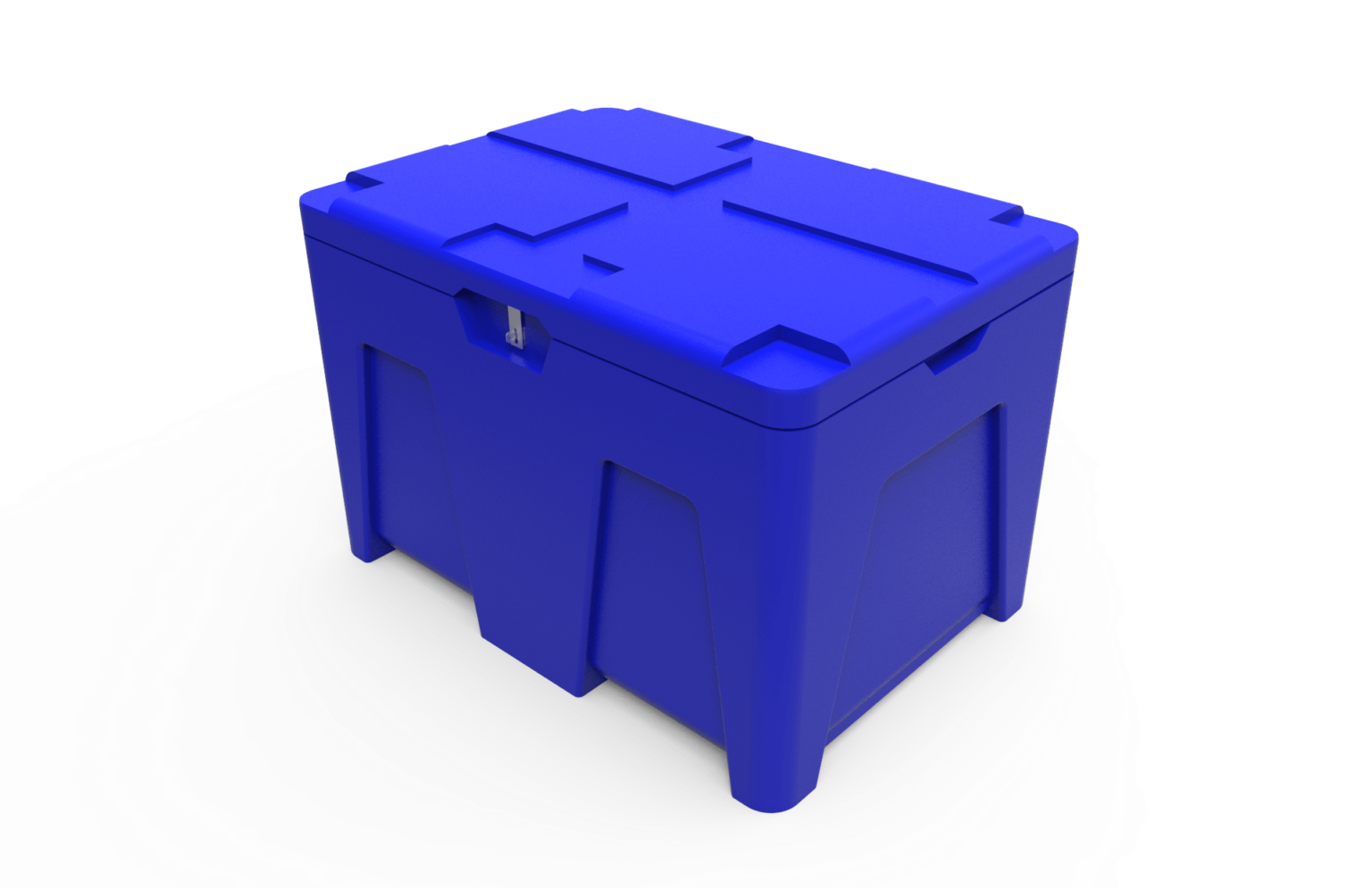 Contenedor de 380 litros para almacenar y proteger bienes de gran tamaño en balsas jaulas, con una construcción resistente y hermética.