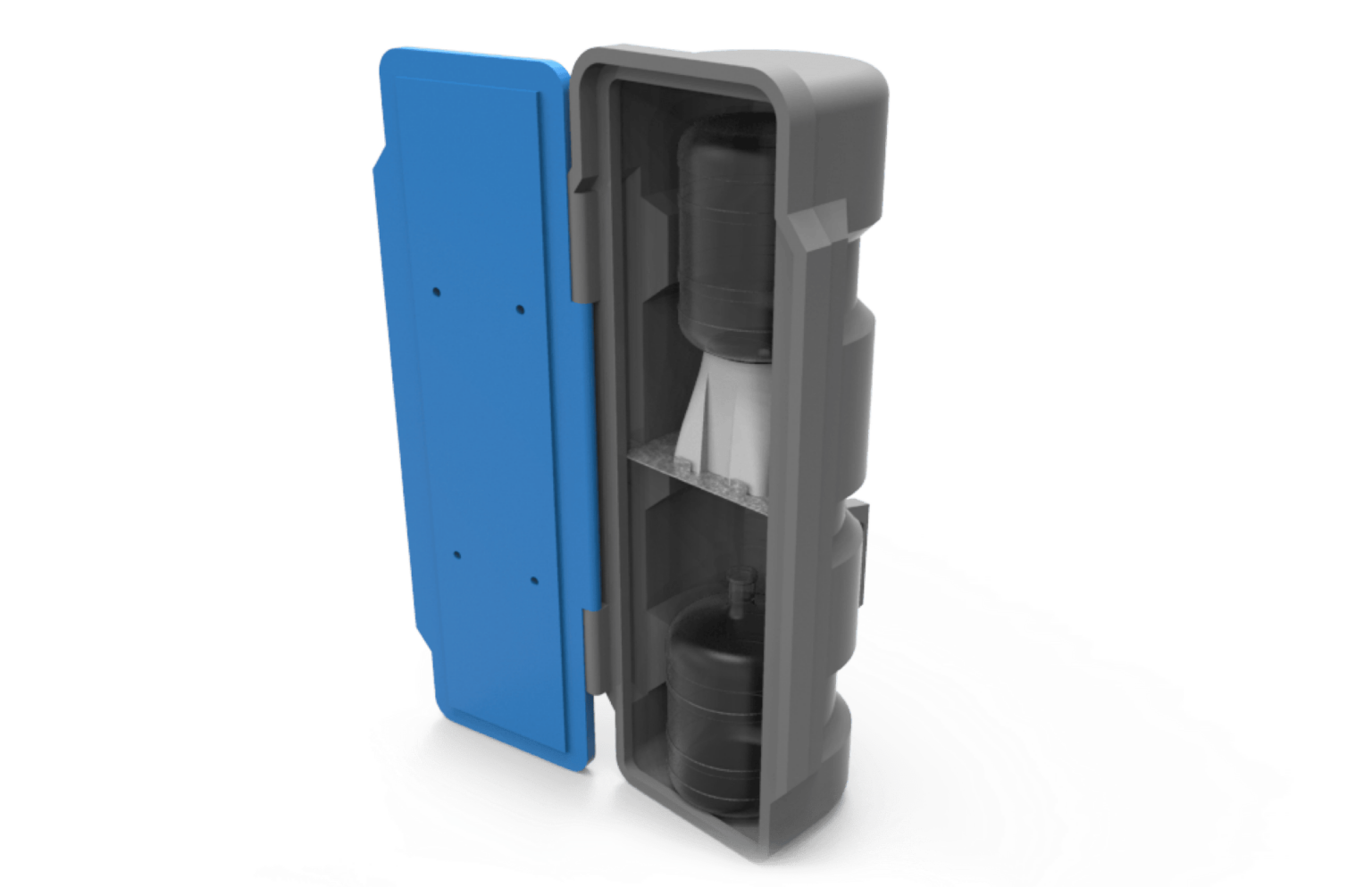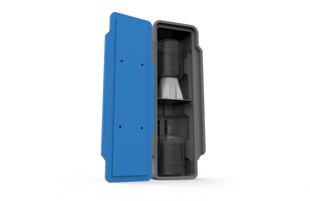 Contenedor plástico ideal para almacenar y proteger bombonas de agua en balsas jaulas, asegurando accesibilidad y cumplimiento normativo.
